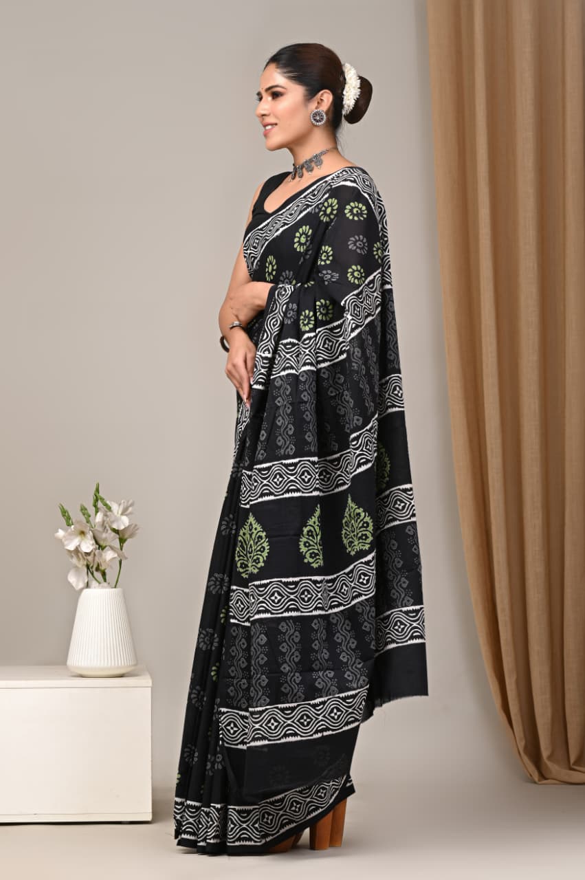 Jaipuri Mulmul Cotton Block Printed Saree With Blouse