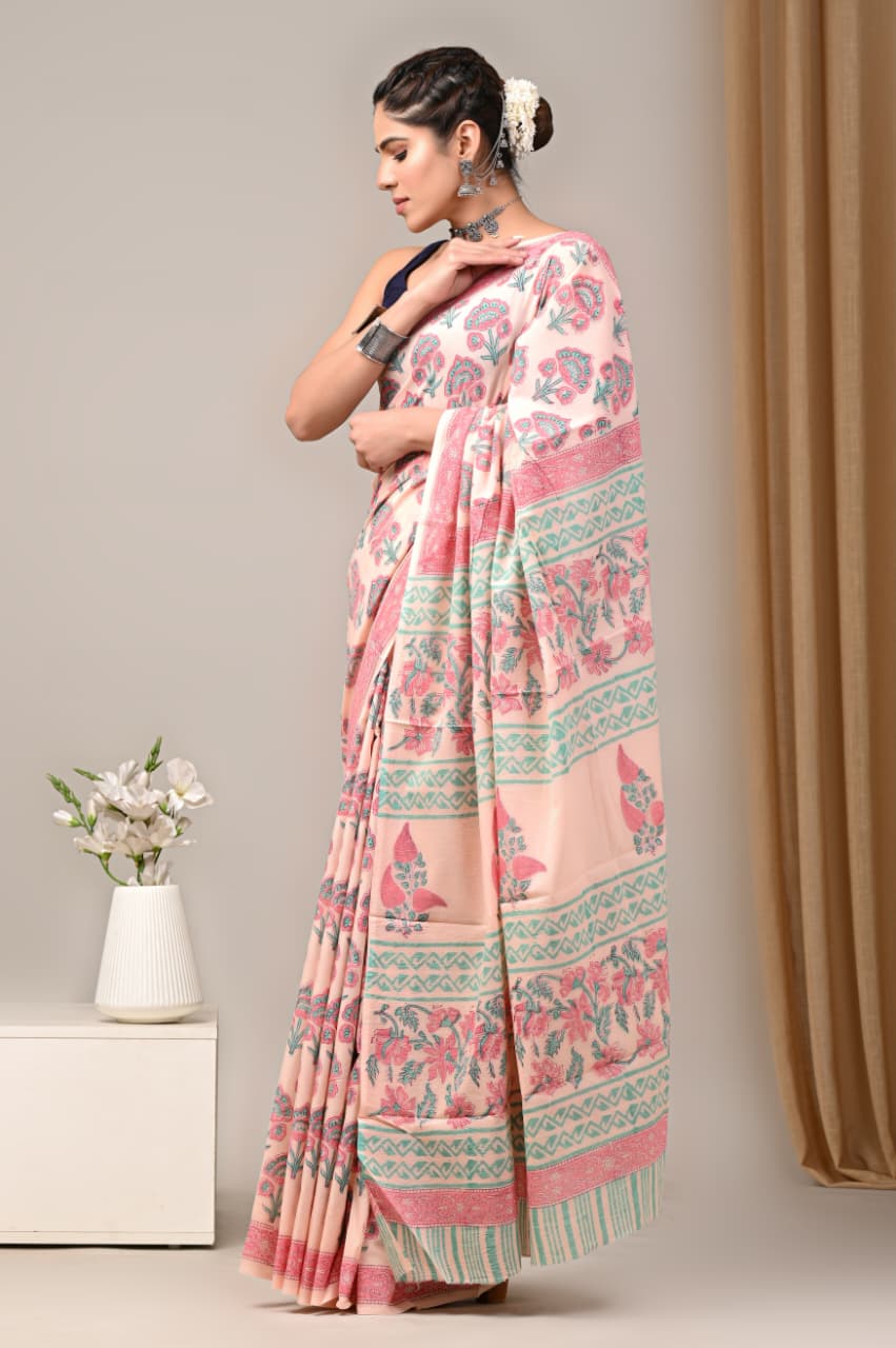 Jaipuri Mulmul Cotton Block Printed Saree With Blouse