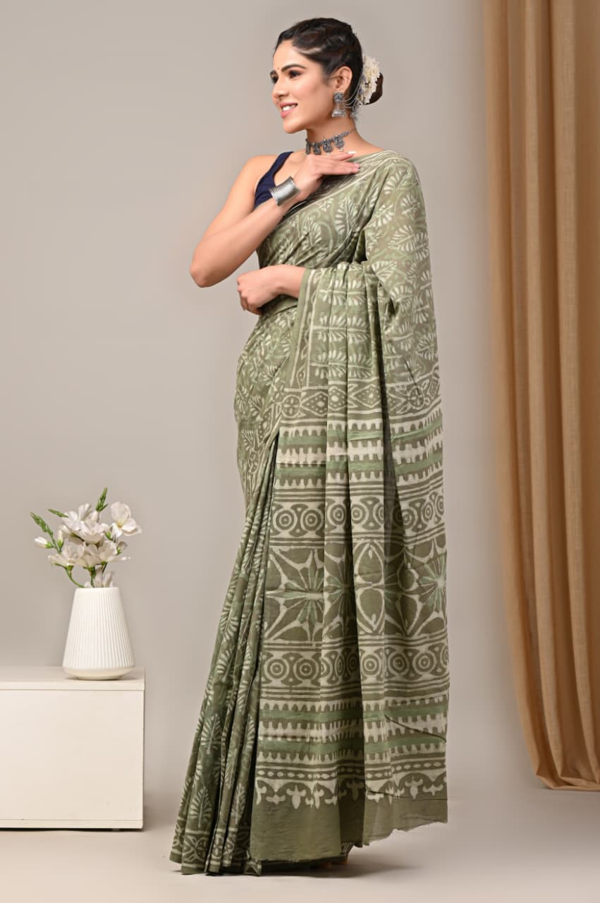 Jaipuri Mulmul Cotton Block Printed Saree With Blouse
