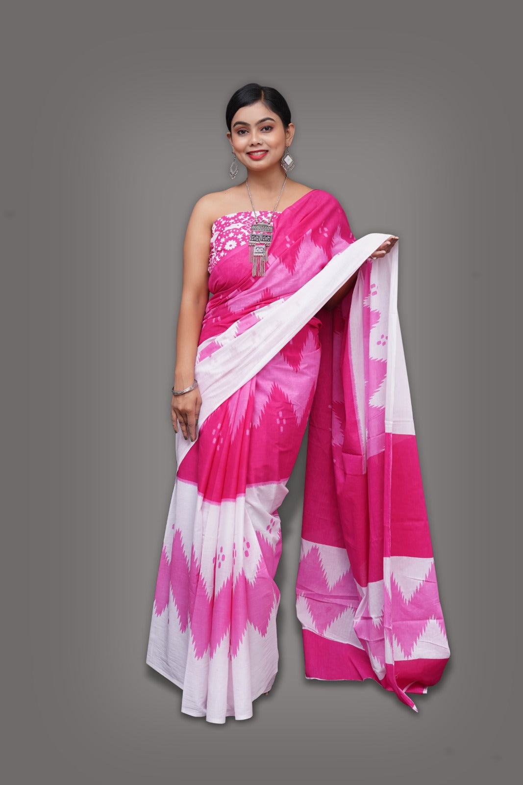 Experience the comfort and style of our attractive printed cotton saree. Made with high-quality cotton, this saree offers both comfort and style, making it the perfect addition to your wardrobe. With its unique and eye-catching print, you'll surely turn heads wherever you go. Elevate your traditional look and feel confident with our saree.